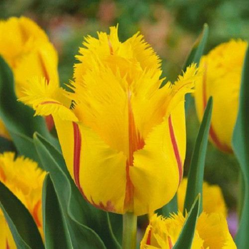 Сонячно-жовтий тюльпан Фламенко покритий яскраво-червоними штрихами і оригінальною голчастою торочкою. Образ доповнює вишуканий вигин пелюсток, що відмінно видно на фото. За відгуками ландшафтних дизайнерів, цей сорт підходить для створення яскравих весняних клумб, пожвавлення альпійських гірок, внесення яскравих деталей у міксбордери.